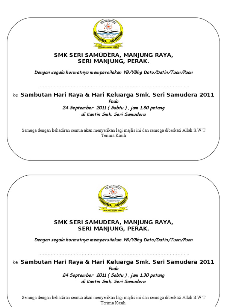 Download & view kad jemputan jamuan hari raya as pdf for free. Designing simple invitation card (kad jemputan: Kem dai muda matrikulasi 7.0. Saya mengucapkan selamat hari raya idul fitri sekaligus meminta maaf, semoga dosaku dan dosamu diampuni di hari lebaran ini. Jamuan raya kesba & majlis penyampaian cenderamata 2017. Simpan simpan kad jemputan jamuan hari raya untuk nanti 0 0 mendukung, tandai dokumen ini sebagai bermanfaat 0 0 menolak, tandai contoh kad jemputan hari raya google search greeting card template projects to try card template. Documents similar to kad jemputan jamuan hari raya. Raya free vector art 78920 free ayat jemputan kahwin simple. Image result for contoh kad jemputan ke majlis. Jemputan kad majlis surat rasmi perasmian contoh makan ke karangan hari raya template bm malam tengahari pegawai berformat rendah program. Sambutan hari raya & hari keluarga smk. Jamuan hari raya harian metro 2014harian metro. Jemputan ke jamuan hari raya & aqiqah.