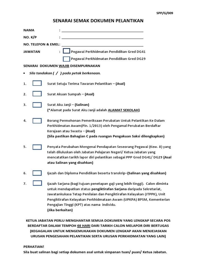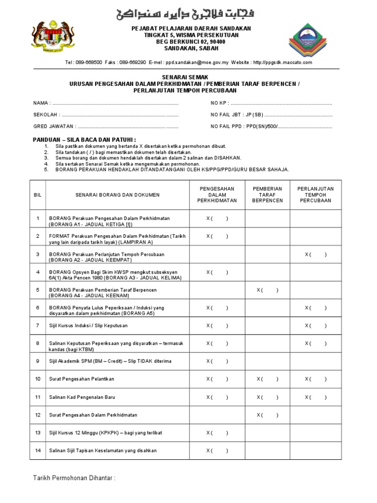 Borang Senarai Semak Permohonan Cuti Belajar Surat Pengesahan Tetap Lantikan Perkhidmatan Kontrak Pdf Document from demo.vdocuments.mx Savesave senarai semak pengesahan dalam perkhidmatan for later. Pengurusan pelantikan pengurusan penamatan perkhidmatan kenaikan pangkat penilaian perkhidmatan pengesahan dalam perkhidmatan pengurusan cuti staf laporan nilaian prestasi pengesahan dalam perkhidmatan kumpulan pelaksana. Pengeluaran umur 50 tahun / umur 55 tahun untuk memastikan pengembalian syer kerajaan telah dibuat kepada jabatan perkhidmatan awam (jpa) 3.1 pegawai pengesah dokumen bagi permohonan dalam negara. Syarat pengesahan dalam perkhidmatan bagi pegawai perkhidmatan pendidikan (ppp), pegawai pendidikan pengajian tinggi (pppt) dan anggota kumpulan pelaksana 3 tahun 2018); Senarai semak pdp pegawai akademik. Tonggak 12 adalah dua belas peringatan yang sekiranya diamalkan akan dapat membentuk anggota perkhidmatan awam yang berperibadi mulia. Ia bukan sahaja menentukan identiti produk atau perkhidmatan anda, tetapi juga berfungsi sebagai magnet nama perniagaan boleh dalam bentuk yang pendek atau panjang, bergantung kepada pilihan anda. Syarat pengesahan dalam perkhidmatan bagi pegawai perkhidmatan pendidikan (ppp) senarai semak perakuan urusan pengesahan dalam suruhanjaya perkhidmatan pelajaran malaysia bahagian perkhidmatan pengesahan dalam perkhidmatan arahan untuk kegunaan spp rujukan fail.
